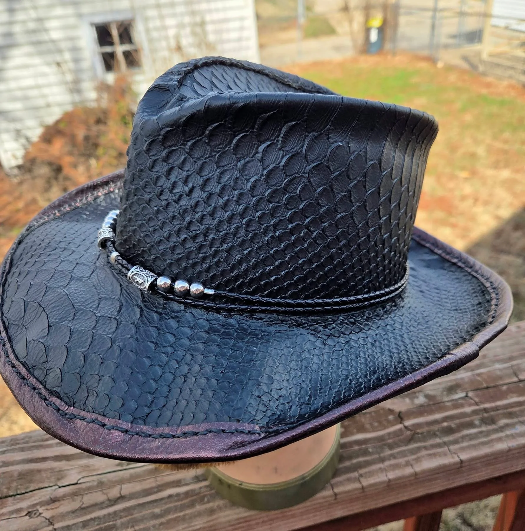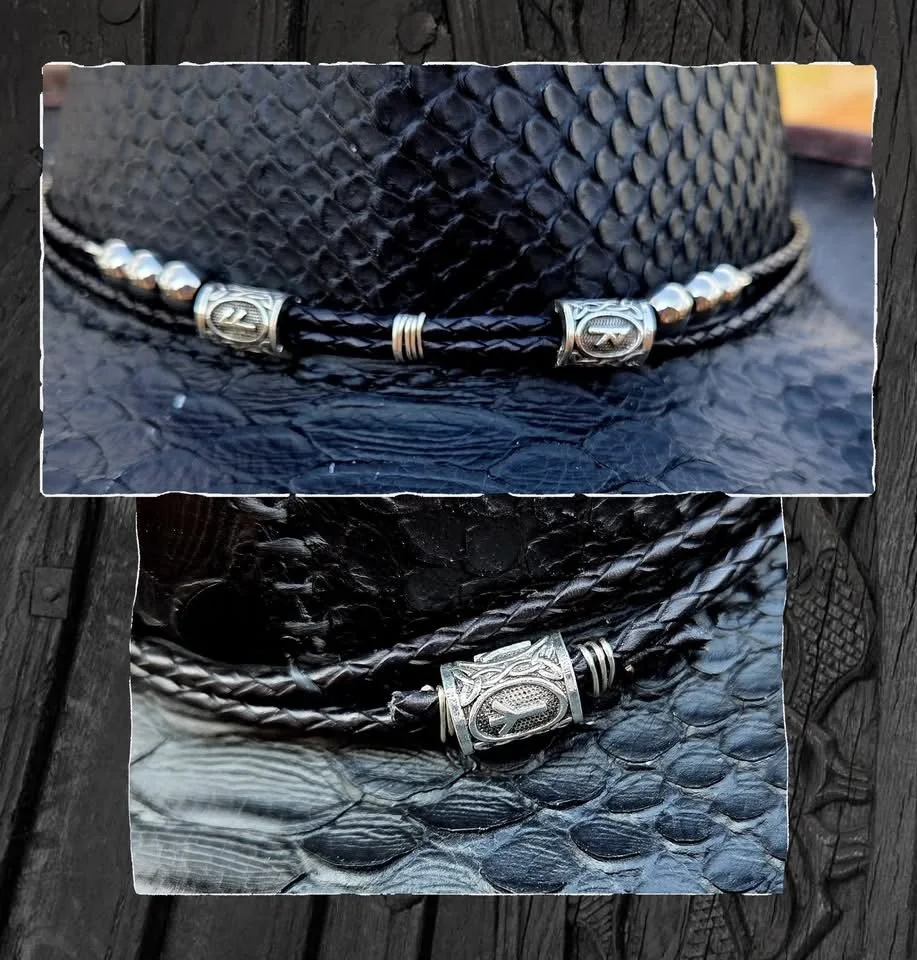 This exquisite handmade leather fedora features two exotic leathers. On the outside is a python textured leather that feels like real snake skin and on the inside is a beautiful rose metallic pattern that adds just the right pop of color. Adorning the brim is a wrapped leather rope with three silver tone runes that represent Odin himself. Earn your place in Valhalla with the All Father.